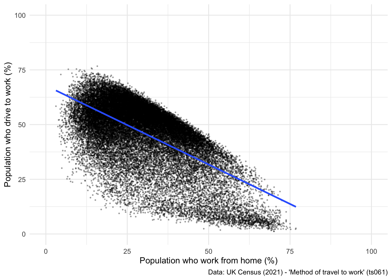 labs(x = "Population who work from home (%)", y = "Population who drive to work (%)",