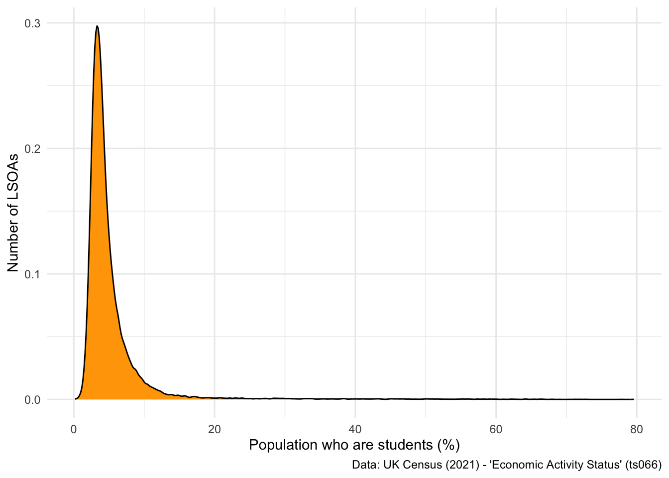 labs(x = "Population who are students (%)", y = "Number of LSOAs",