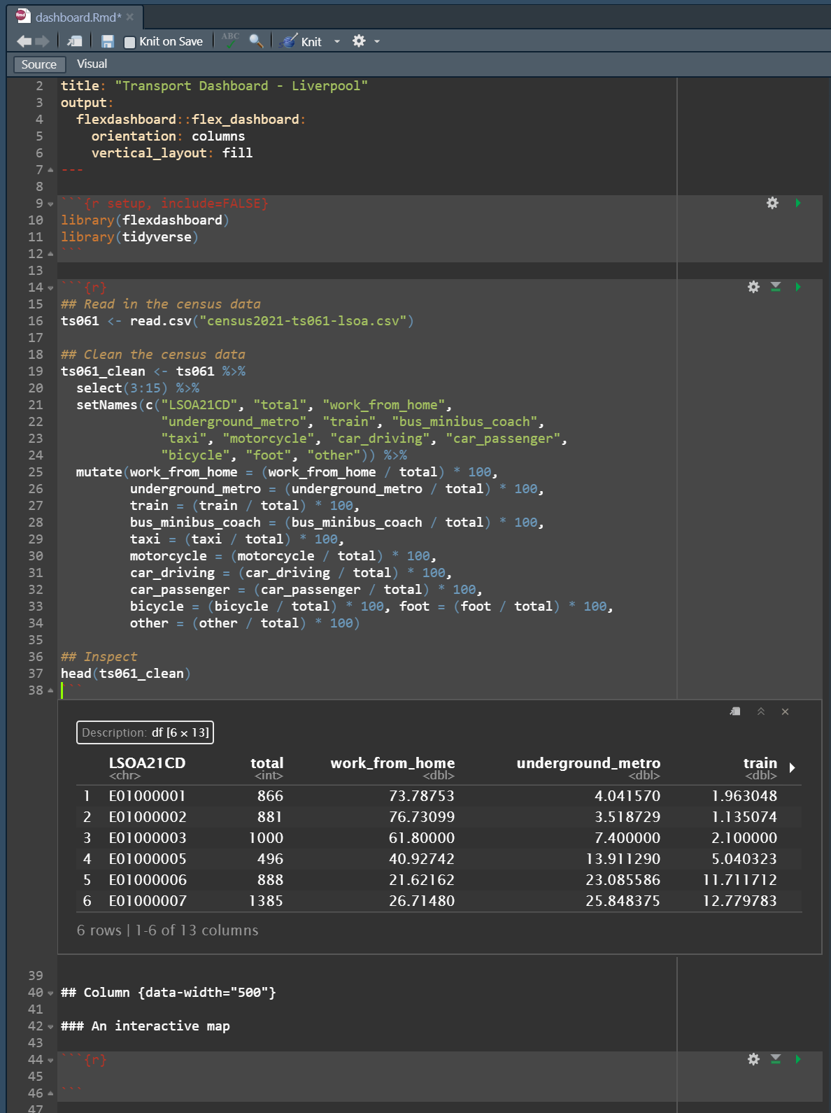 The code chunks need to be placed before the dashboard structural parameters - i.e. before the ## Column commands in the script. Have a look at the example below where we read in and clean the census data we were using on Day 2: