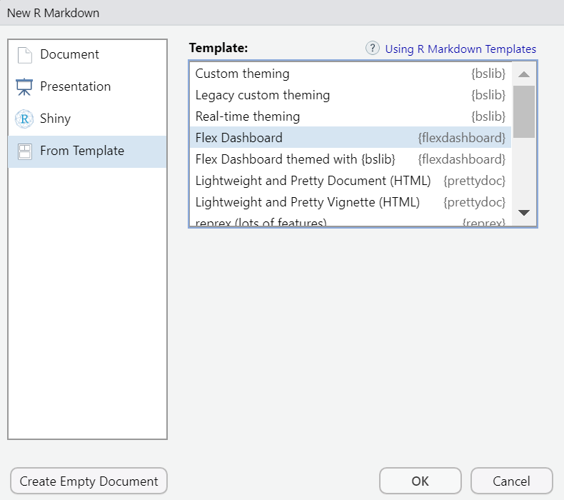 The final step is to create a new file which will be used to build your dashboard. In R, Go to File > New File > R Markdown > From Template > Flex Dashboard (see below).