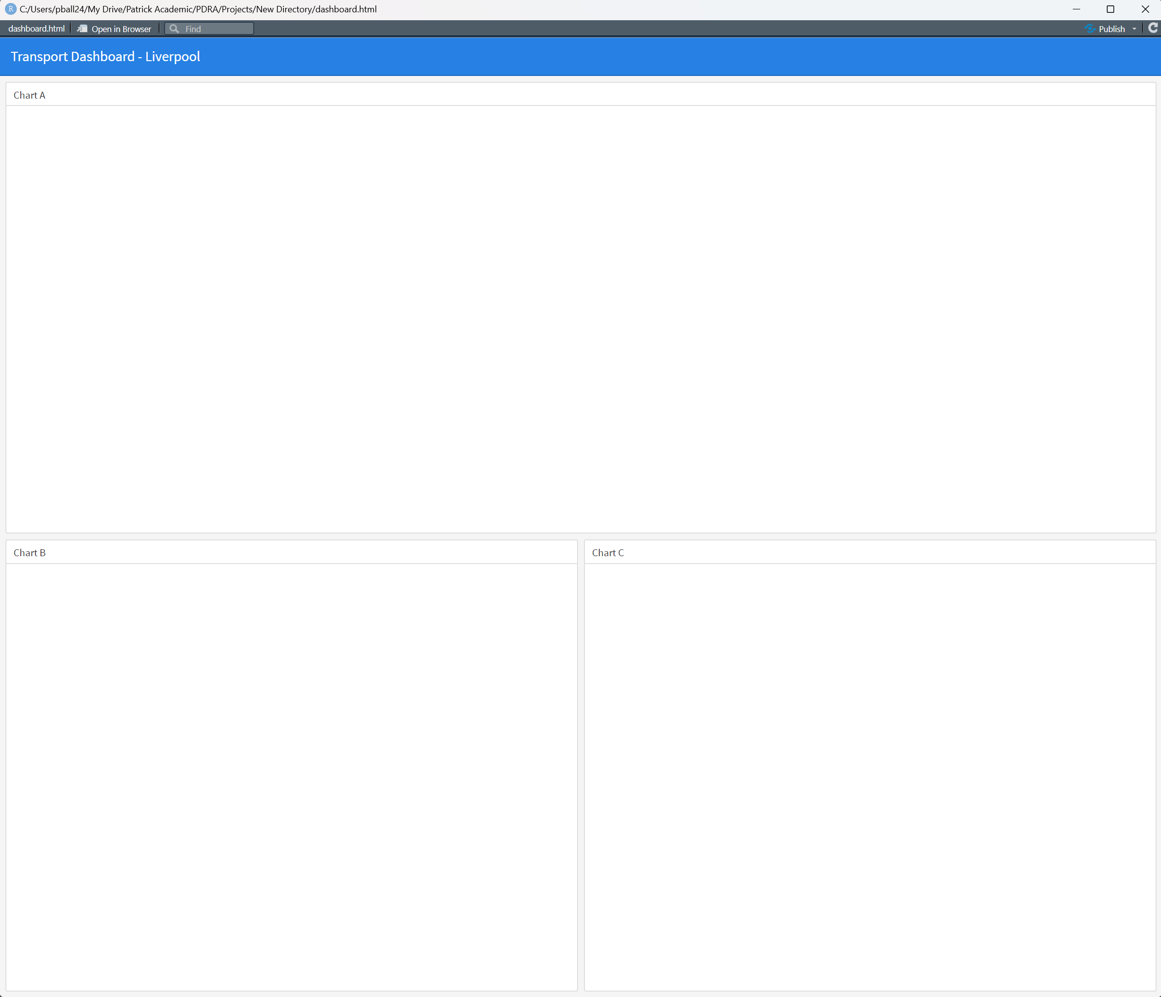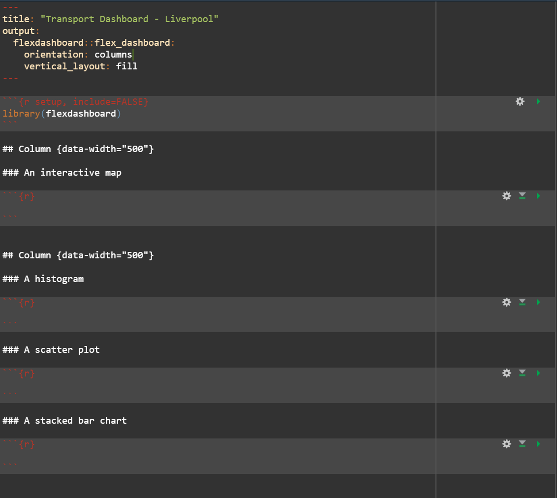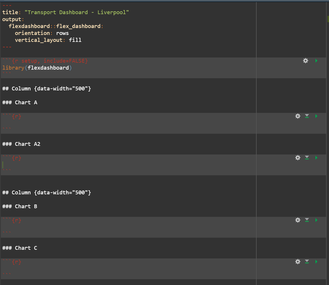 So you can see that the dashboard has three panes set up to host different types of visualisation. In the .Rmd file you’ll notice that each ## denotes the start of a new column, and each ### denotes a new pane for visualisation.
