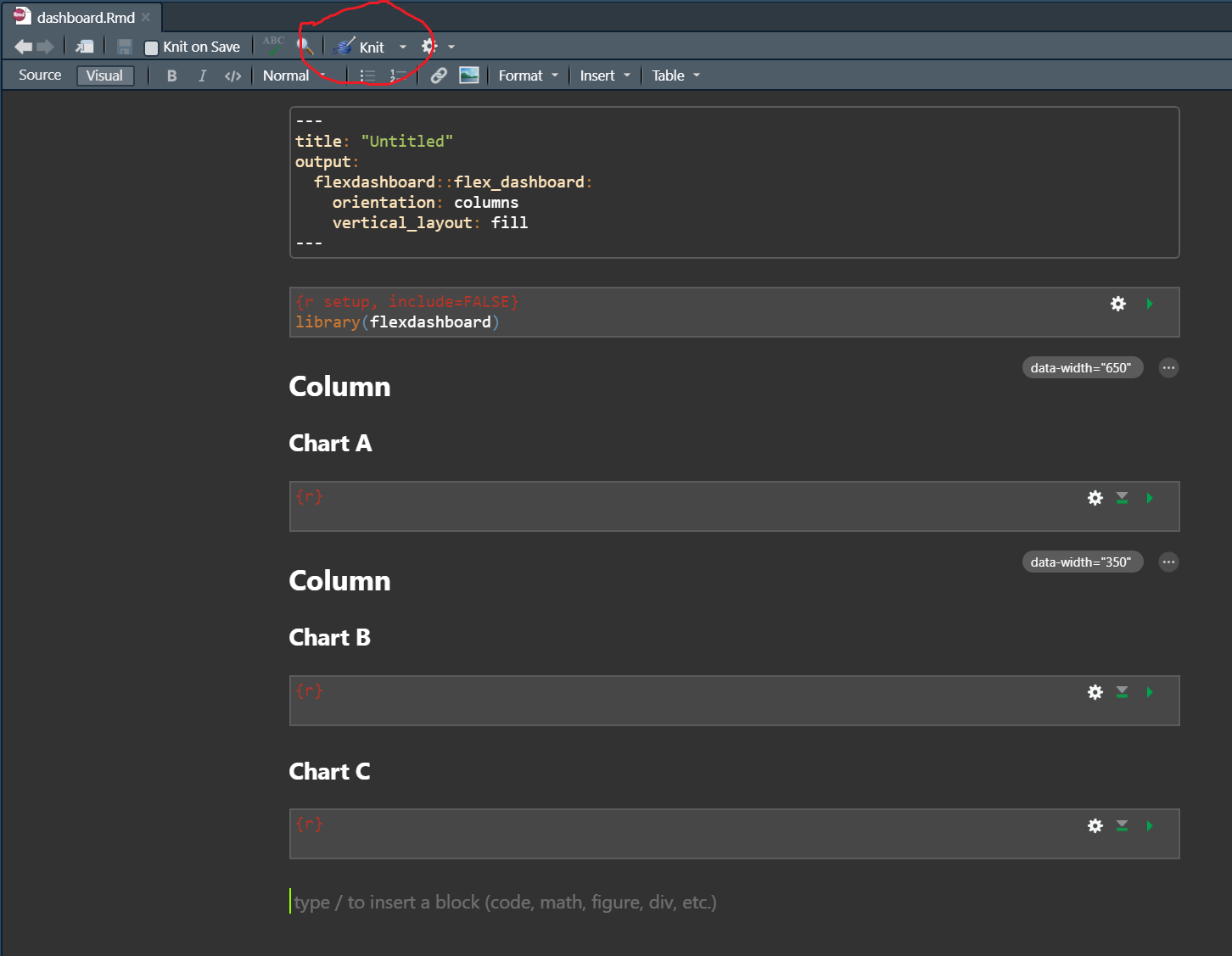However, the visualisations need to be produced within the .Rmd file before they can be displayed on the dashboard itself. This is where you can use code chunks within the .Rmd file to re-run some of the analyses we did yesterday to produce visuals for the dashboard.