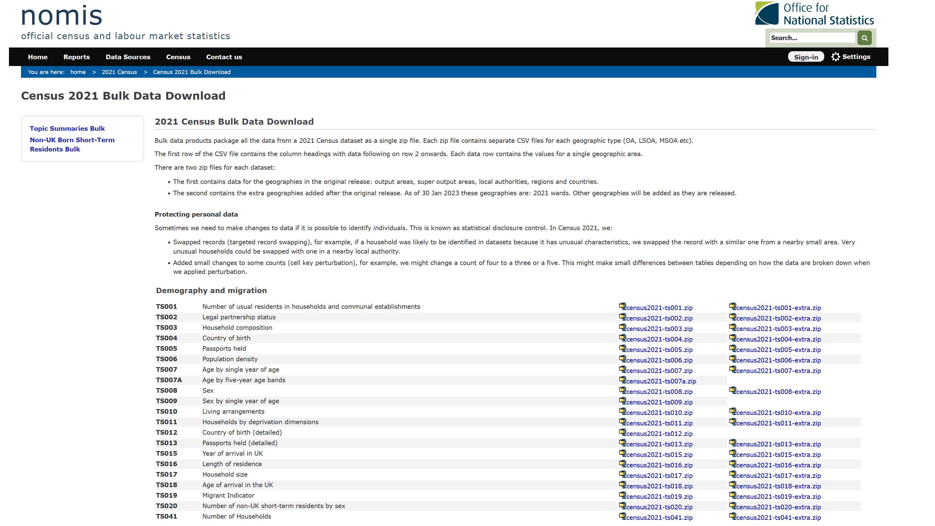 For example, on NOMIS there is a page called ‘Census 2021 Bulk Data Download’, which contains .zip files for different tables of data available from the latest census.