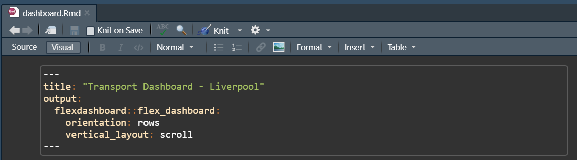 For the remainder of the practical, you need to be working in your new .Rmd file. This is where you will build and deploy your dashboard, so please make sure you are working in this file - ‘dashboard.Rmd’.
