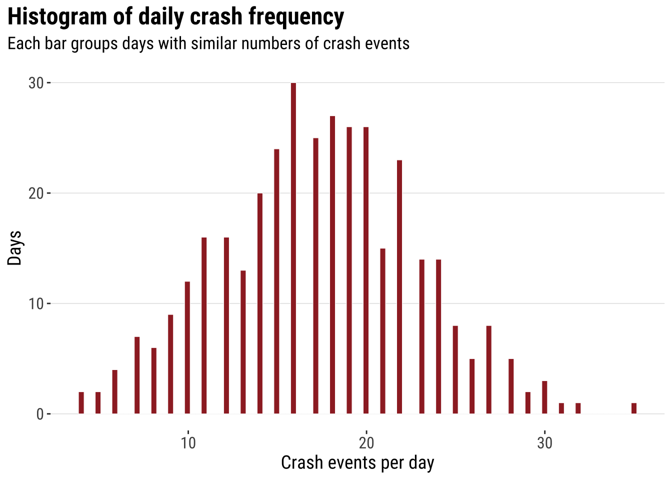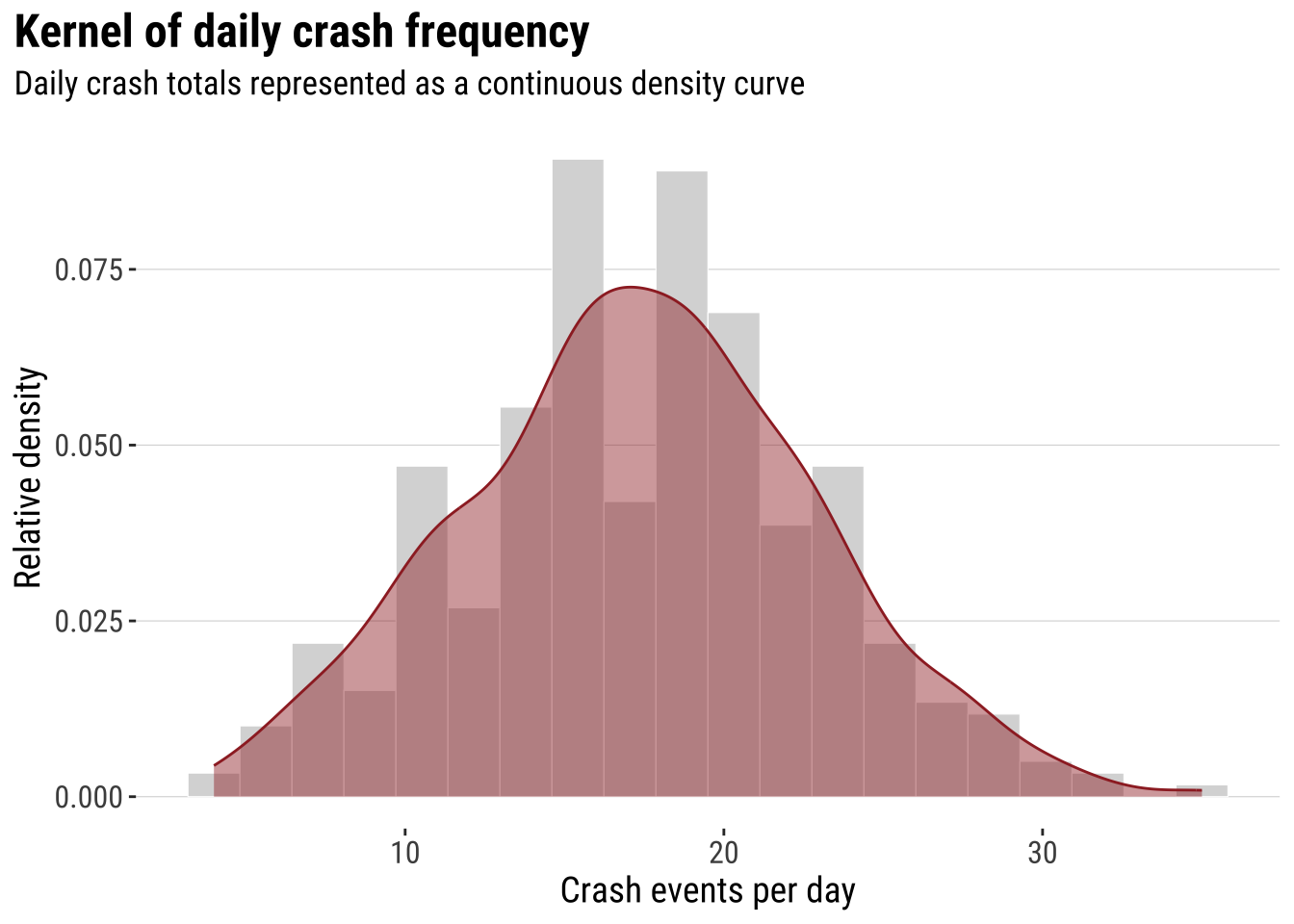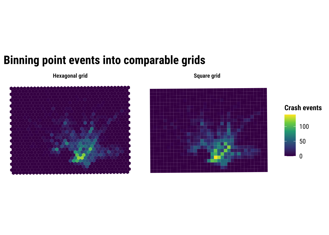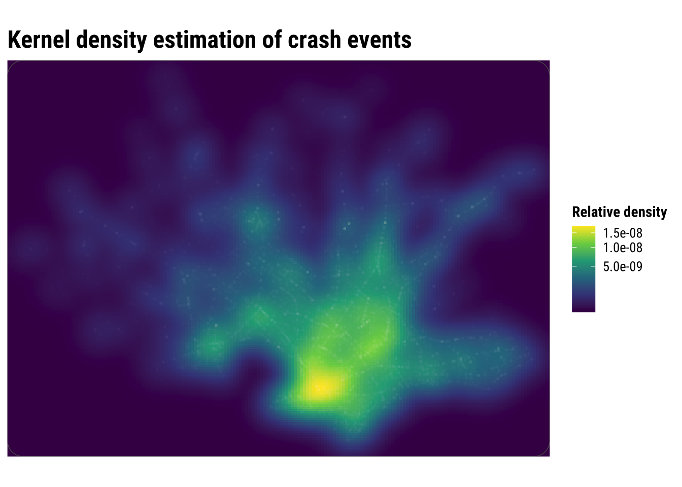 Point-pattern maps are often compelling because they show spatial concentration quickly and clearly. But concentration is not the same as risk. A dense cluster of crash events may reflect heavy traffic, a complex road network, a busy commercial corridor, or simply the fact that more people and vehicles pass through that area. Without a denominator or exposure measure, these maps tell us where events accumulate, not necessarily where conditions are most dangerous.