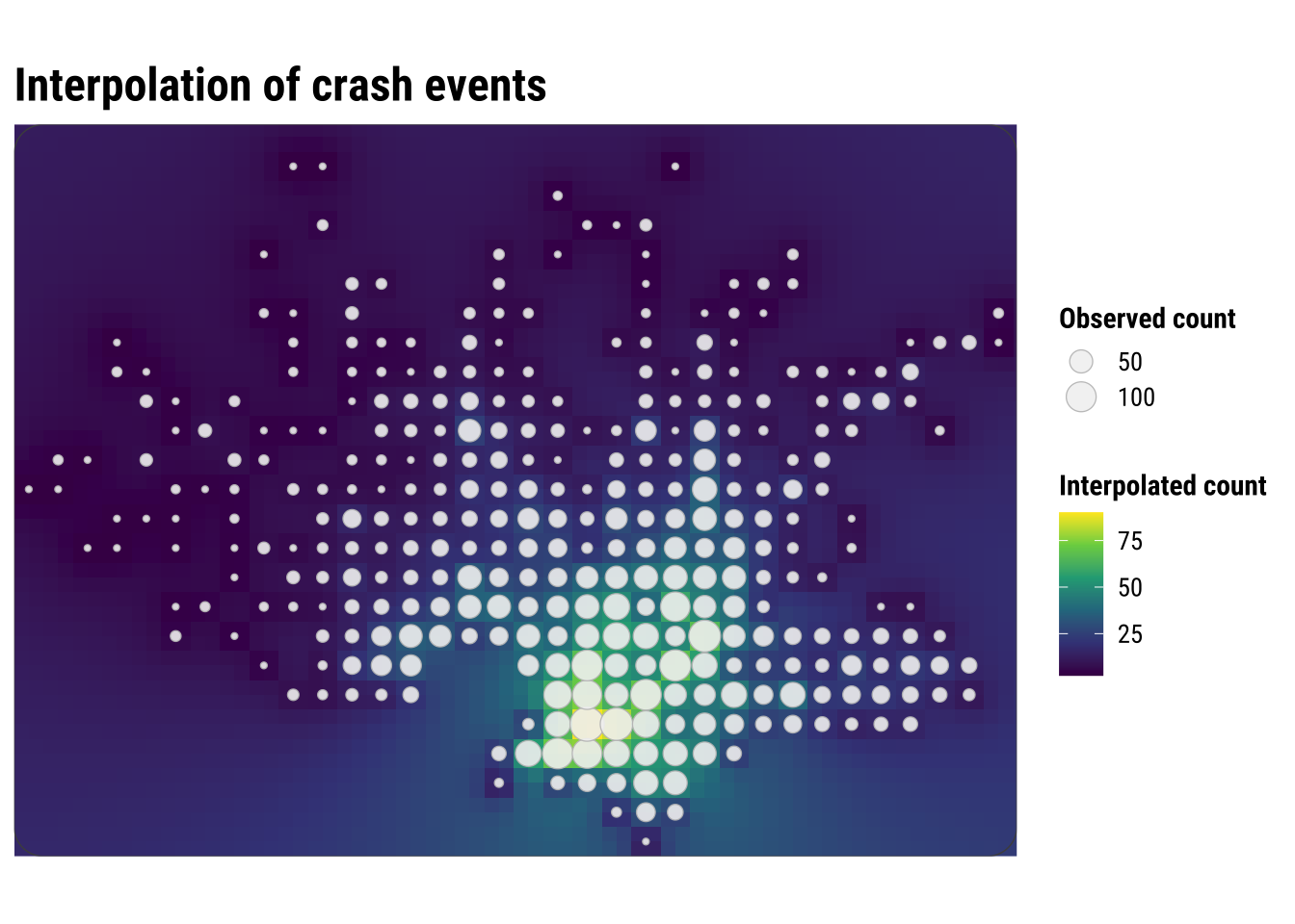 In this chapter, we use interpolation cautiously because crash events are not direct measurements of a continuous physical field such as temperature or rainfall. To make the example more sensible, we first aggregate events to the centroids of 1 kilometre grid cells and then interpolate those local counts with inverse distance weighting (IDW). Nearby cells therefore contribute more strongly to the estimated surface than distant cells. This is useful pedagogically because it shows what interpolation does. It estimates unobserved values from nearby observed ones, even though the resulting surface should still be treated as an exploratory approximation rather than a definitive representation of crash risk.