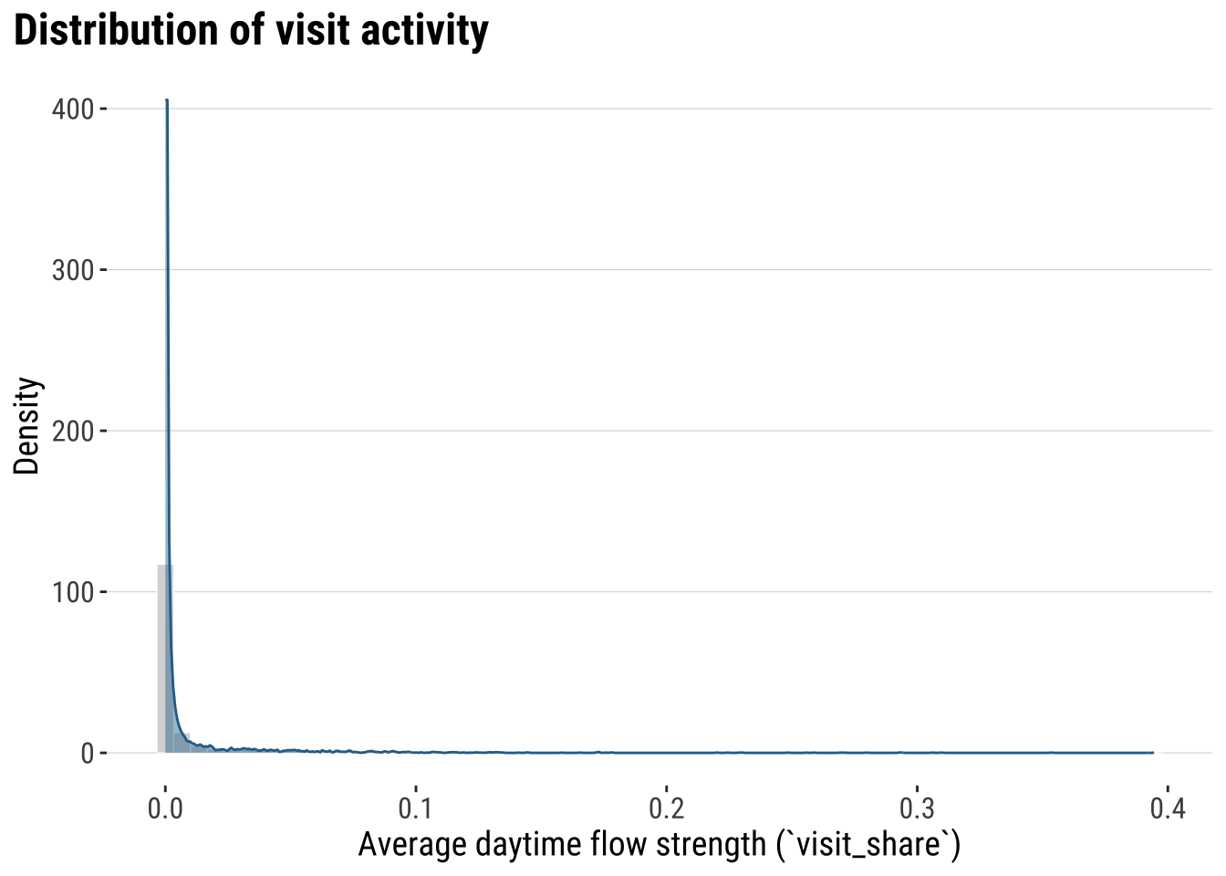 An important detail is that the original data reports repeated observations for an OD pair. The same home_gadm_id and visit_gadm_id can appear various times because multiple fine-grained observations are mapped into the same GADM polygons. As a result, the raw row count is larger than the number of distinct polygon OD pairs. For our purposes, we will focus on analysis at the ADM2 level and daytime patterns. We therefore filter to daytime only and then aggregate repeated rows to one OD record per origin-destination pair using the average raw visit_fraction. In the aggregated table, that average is stored in a new column called visit_share. We will do this data transformation in the next section.